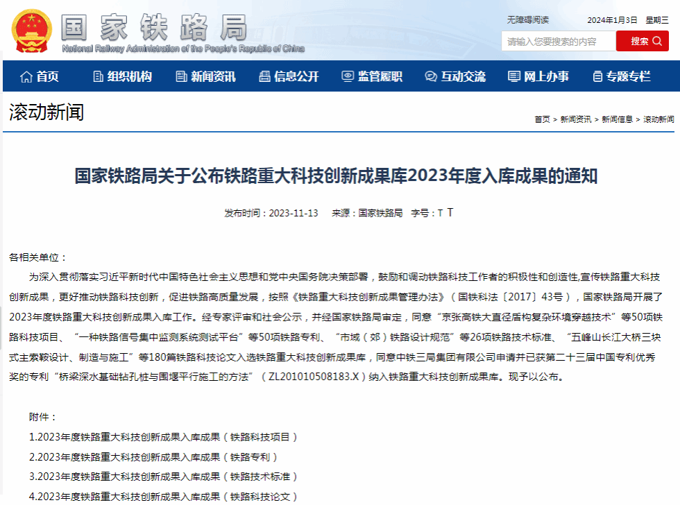鐵路重大科技創(chuàng)新成果庫由國家鐵路局設(shè)立,包括鐵路科技項(xiàng)目、鐵路專利、鐵路技術(shù)標(biāo)準(zhǔn)和鐵路科技論文四類,在鐵路行業(yè)科技創(chuàng)新方面具有標(biāo)志性和代表性,具有較強(qiáng)的實(shí)用性,標(biāo)志著鐵路科技的先進(jìn)水平,代表著鐵路科技的發(fā)展方向。經(jīng)專家評審和社會公示,并經(jīng)國家鐵路局審定,2023年共有50項(xiàng)鐵路科技項(xiàng)目、50項(xiàng)鐵路專利、26項(xiàng)鐵路技術(shù)標(biāo)準(zhǔn)、180篇鐵路科技論文入選鐵路重大科技創(chuàng)新成果庫。